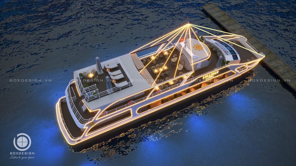 Du thuyền khai thác tại lòng hồ hòa bình, Boxdesign bố trí tổng thể với Cầu trượt hơi, khu vực tắm tráng, Không gian nhà hàng sang trọng...
